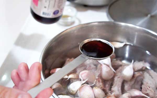 電熱鍋洗凈,放入排骨、蒜頭,加入清水約2000c.c.。加入鹽2小匙、醬油1大匙調味。