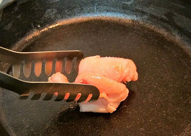 生肥豬肉下鍋,用夾子夾住生肥豬肉,以內(nèi)圈到外圈的方式呈螺旋狀在鍋內(nèi)壁不停地擦拭,使溢出的油脂均勻地涂滿整個(gè)鍋面。