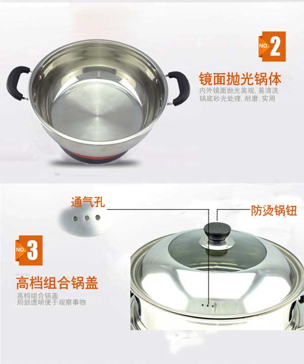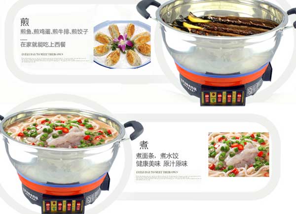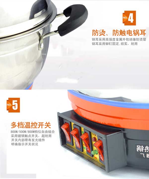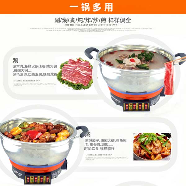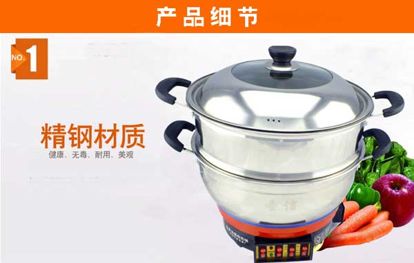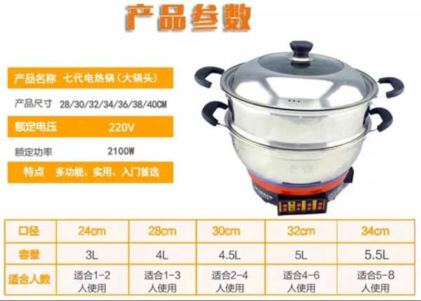 七代大鍋頭電熱鍋,多功能,煎、炸、炒、烙、蒸、燜、涮樣樣精通,鍋體采用不銹鋼制造,蒸籠采用不銹鋼一體成型蒸籠,內(nèi)部采用三根加熱管獨(dú)立加熱,三檔+保溫?fù)跷?,?nèi)部設(shè)有溫控器,可有效防止干燒導(dǎo)致電熱鍋的損壞,結(jié)實(shí)耐用,美觀實(shí)用。