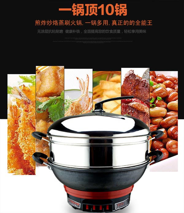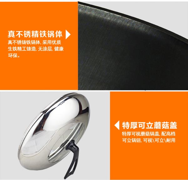 真不銹鑄鐵電熱鍋鍋體采用精鐵鑄造而成,采用特殊工藝,不生銹,配置高檔蒸籠,特厚蘑菇鍋蓋,是一款多功能高檔電熱鍋。